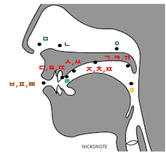 아래의 그림을 보면 자음이 소리 나는\ 원리에 대해 포인트를 지정한 것인데 참고만 하길 바란다.